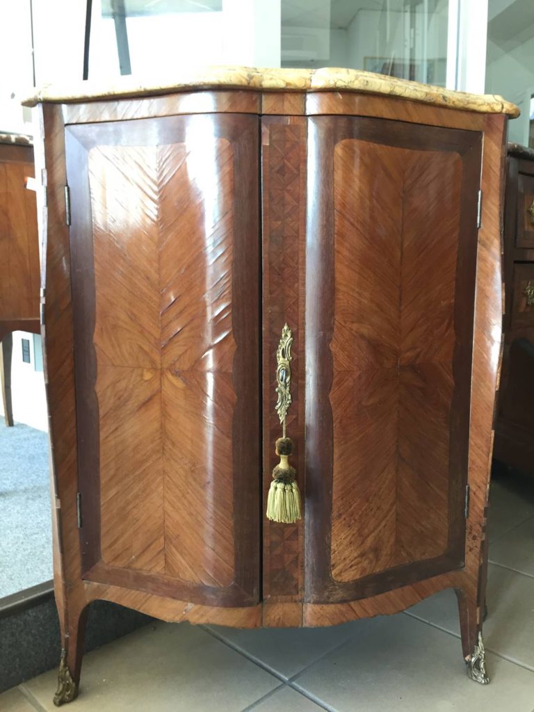 Descrizione: angoliera in legno di viola e mogano, piano marmo.
